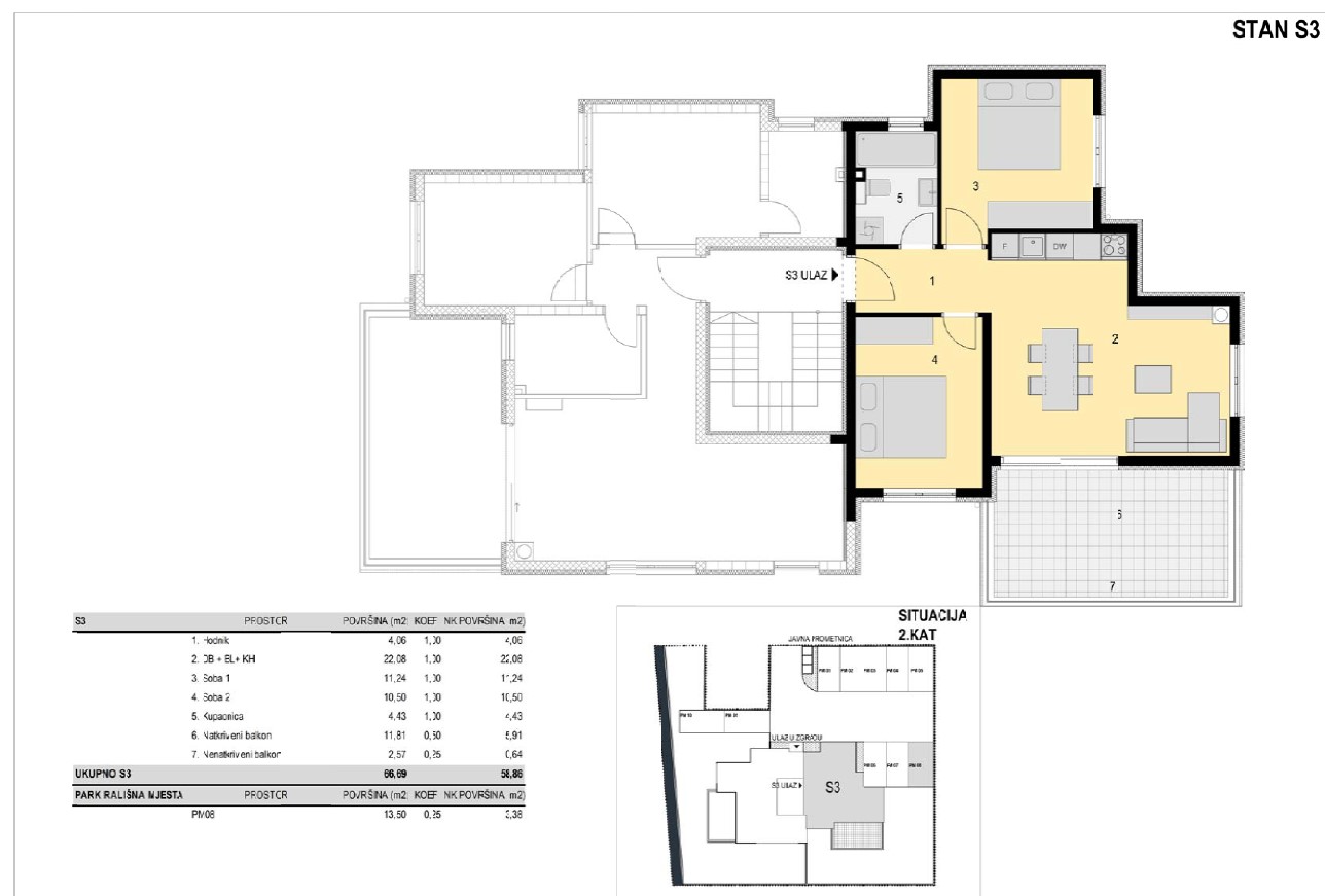 S3 – Prodaje se 4-sobni apartman ukupne površine 62.24m2 koji se nalazi na 2.katu apartmanske zgrade, a sastoji se od: