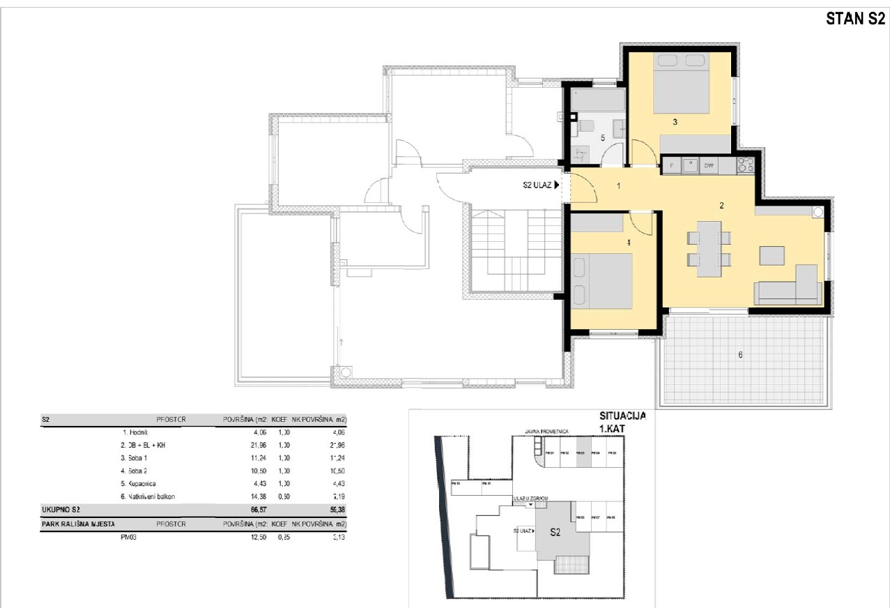 S2 – Prodaje se 4-sobni apartman ukupne površine 62,51m2 koji se nalazi na 1.katu apartmanske zgrade, a sastoji se od: