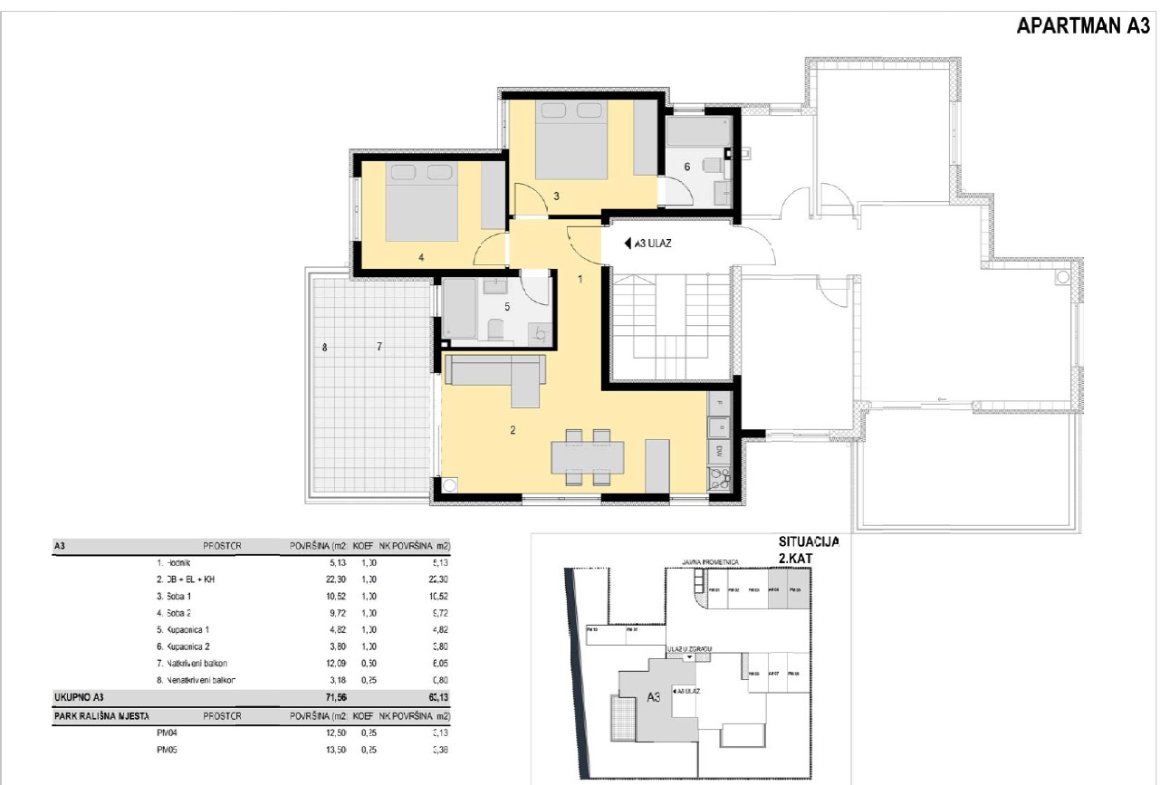 A3 – Prodaje se 3-sobni apartman ukupne površine 69.64m2 koji se nalazi na 2.katu apartmanske zgrade, a sastoji se od: