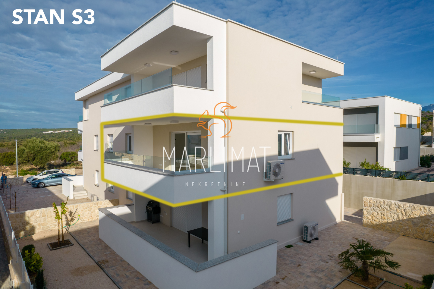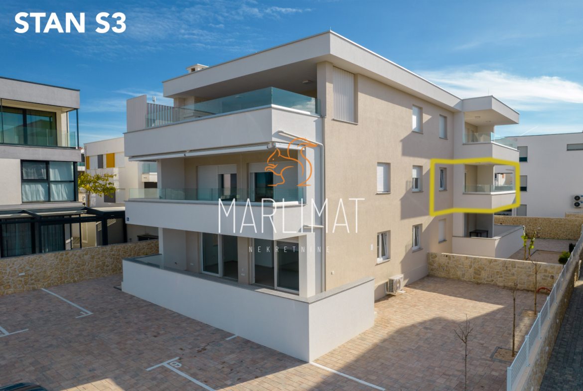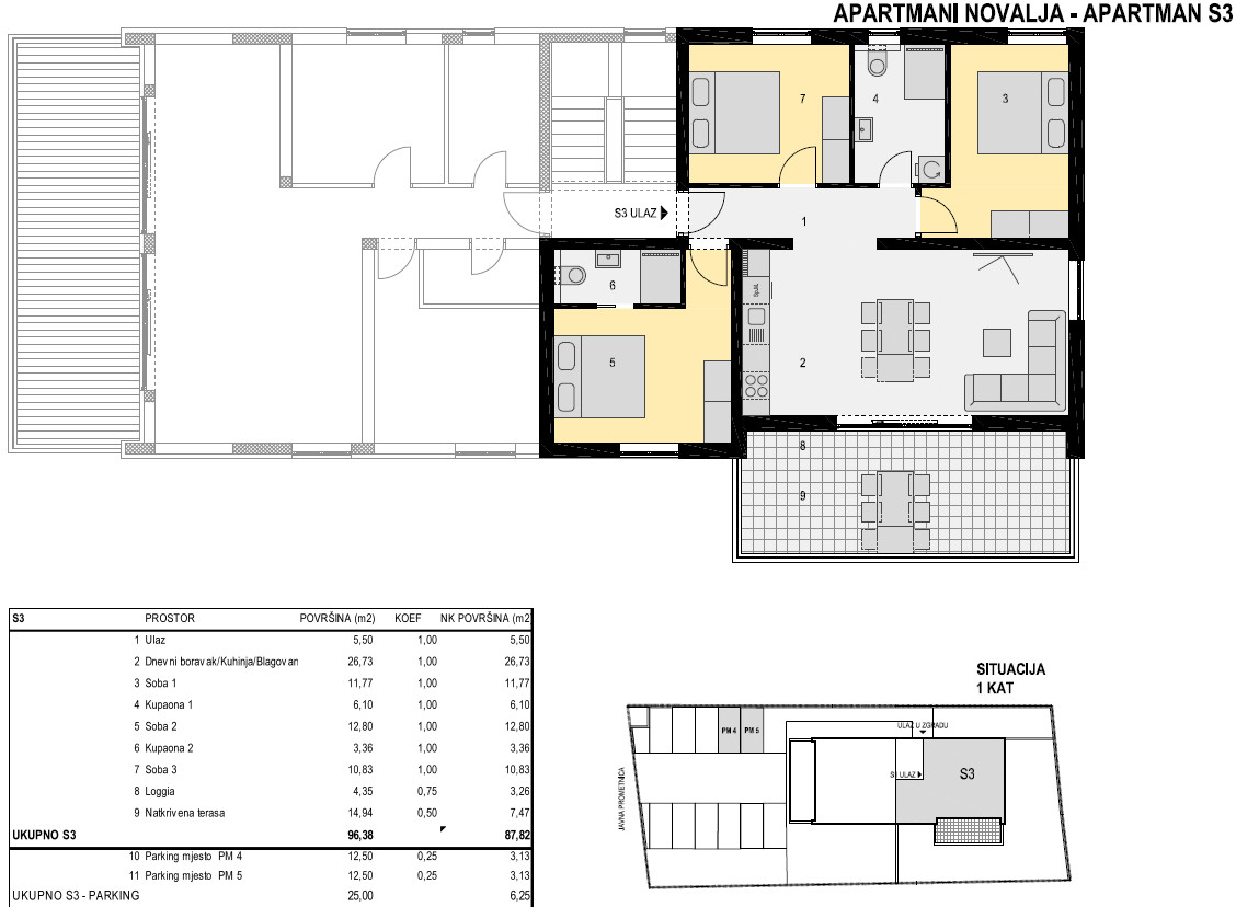 APARTMAN S3 ukupne veličine 95.21m2 nalazi se na 1. katu zgrade i sastoji se od STAMBENOG DIJELA površine 76,95m2 (hodnik, spavaća soba 1, spavaća soba 2, spavaća soba 3, kupaona 1, kupaona 2, dnevni boravak, kuhinja i blagovaonica), TE VANJSKOG DIJELA terasa natkrivena-18,73m2, vrt/spremište – 4,50m2, parking br.1–13,75m2, parking br.2 –15,78m2.