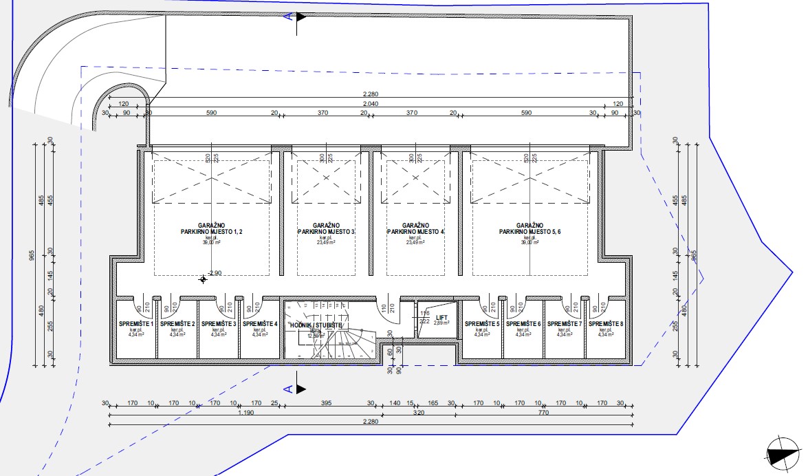 Dvije garaže imaju po dva parkirna mjesta i veličine su 39m2 dok su ostale dvije garaže sa jednim parkirnim mjestom i veličine su 24.90m2.