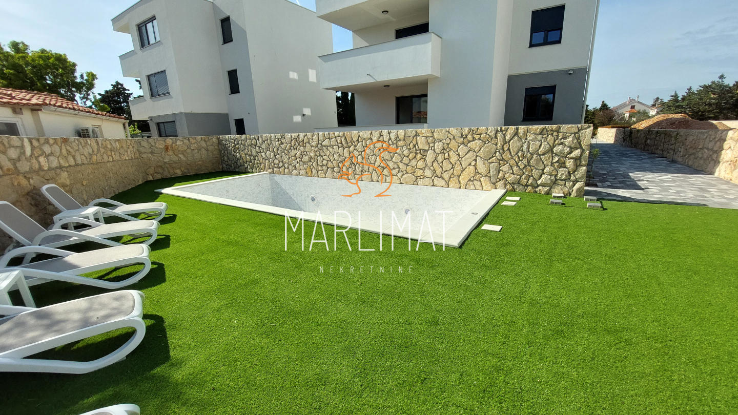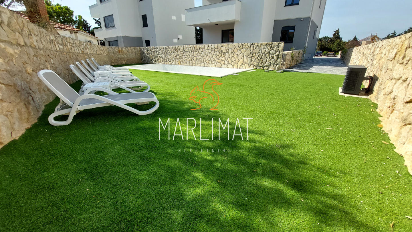 Apartmanima u prizemlju pripadaju vrtovi. Ispred zgrade nalazi se zajednički GRIJANI I MASAŽNI bazen dimenzije 8,5 x 4 metra koji je na korištenje svim apartmanima.