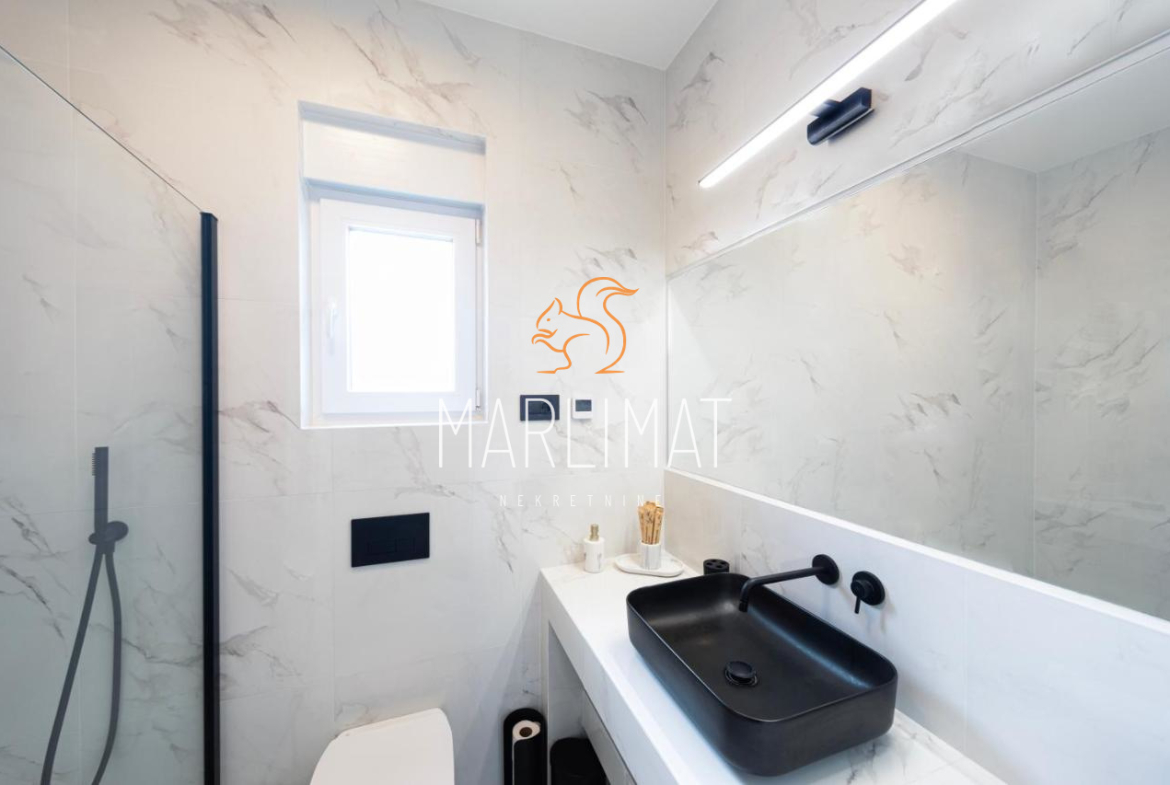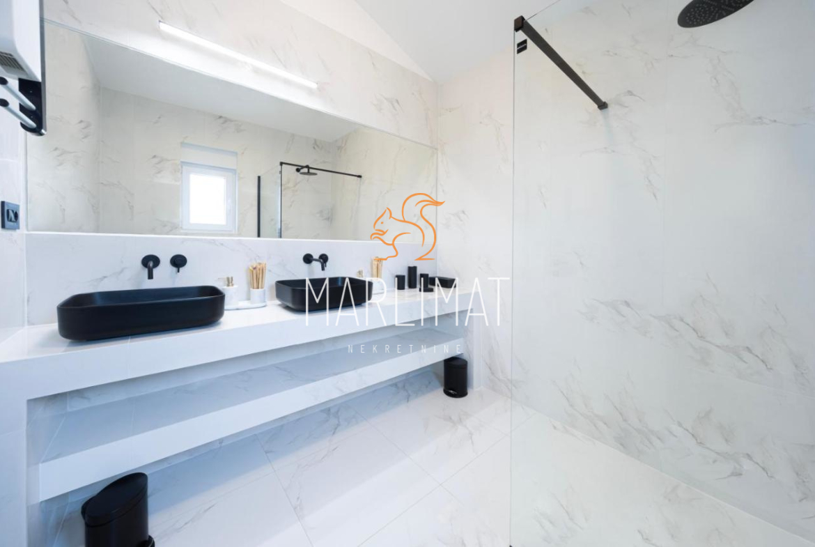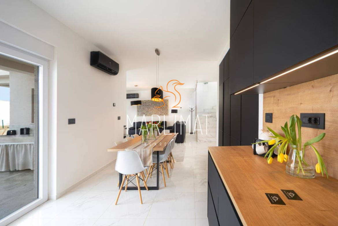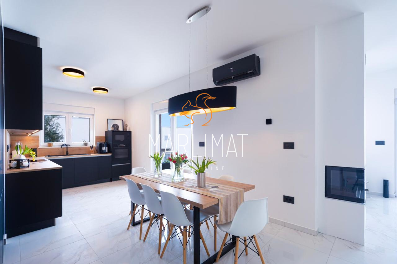 Kuća ima 2 etaže te se prizemlje sastoji od hodnika, dnevnog boravka, kuhinje s blagavaonicom, jednom spavaćom sobom, kupaonicom, dodatnim WC-om, ostavom te dvije natkrivene terase. Kat se sastoji od hodnika, dvije spavaće sobe, dvije kupaonice, walk-in prostorom za garderobu te dvije natkrivene terase.
