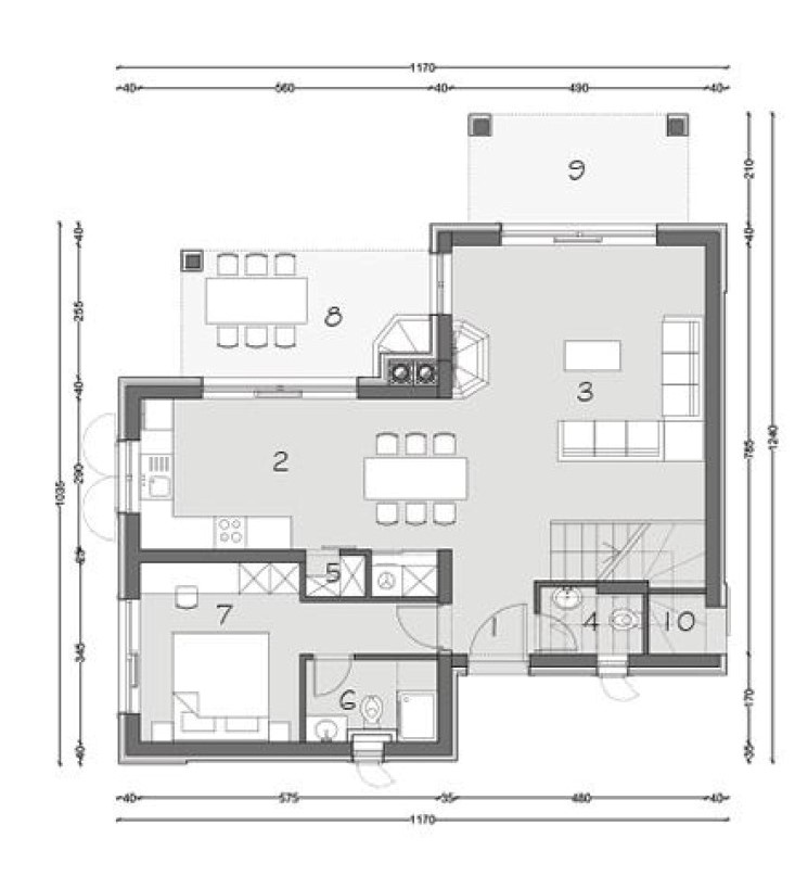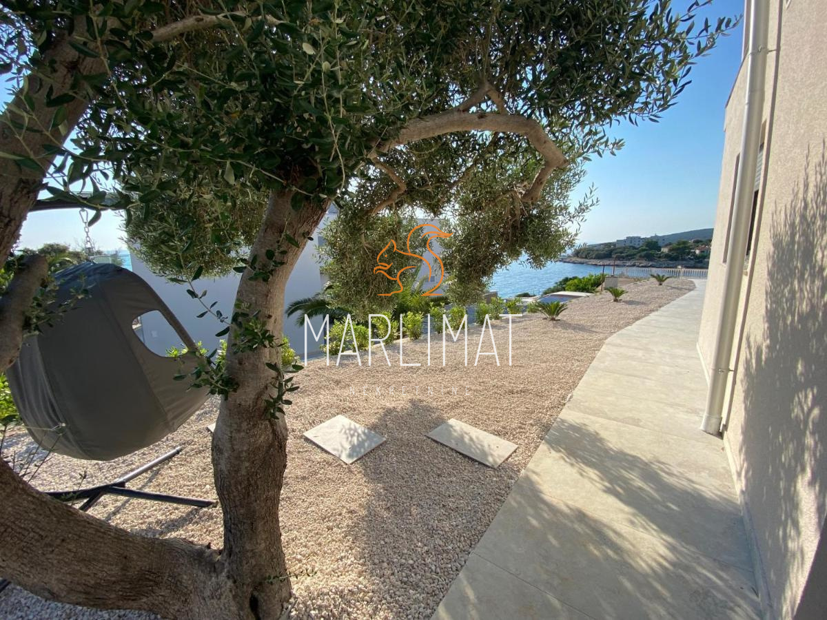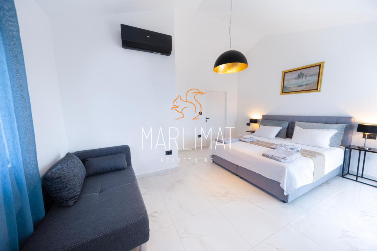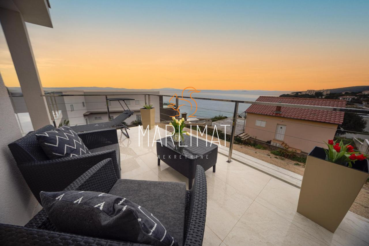 Kuća ima 2 etaže te se prizemlje sastoji od hodnika, dnevnog boravka, kuhinje s blagavaonicom, jednom spavaćom sobom, kupaonicom, dodatnim WC-om, ostavom te dvije natkrivene terase. Kat se sastoji od hodnika, dvije spavaće sobe, dvije kupaonice, walk-in prostorom za garderobu te dvije natkrivene terase.